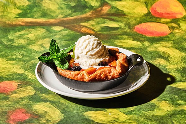 Peach & Blackberry CrostataLight and crispy open-faced peach and blackberry tart freshly baked and topped with vanilla ice cream, garnished with fresh mint