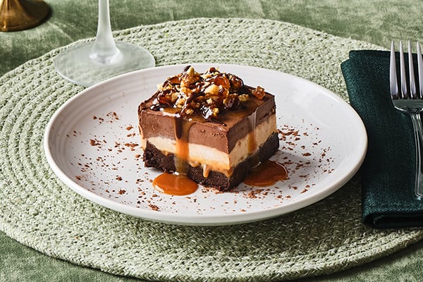 Chocolate Peanut Butter BrownieLayers of chocolate and peanut butter mousse over a chocolate brownie, topped with walnut brittle, chocolate and salted caramel sauce and lightly dusted with cocoa powder