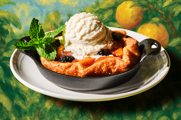 Peach & Blackberry CrostataLight and crispy open-faced peach and blackberry tart freshly baked and topped with vanilla ice cream, garnished with fresh mint